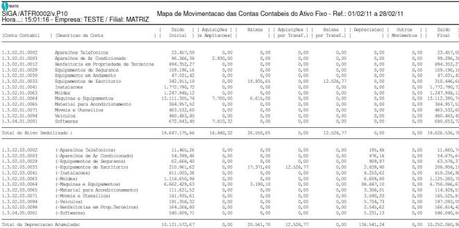Mapa de Movimentação Mensal do Ativo Fixo Desenvolvido para auxiliar a área de controladoria das empresas, esse relatório demonstra de forma simples e sintética as movimentações de um determinado período do Ativos Imobilizados da empresa. Essa solução consegue reproduzir o saldo inicial do imobilizado de qualquer que seja o período, demonstra de forma clara as aquisições, baixas, transferências e a depreciação sofrida nas contas contábeis do imobilizado. É uma ferramenta ideal para as áreas de contabilidade e controladoria acompanharem e verificarem o saldos contábeis do ativo no modulo de ATIVO FIXO e conciliar com os saldos contábeis da Contabilidade da empresa.