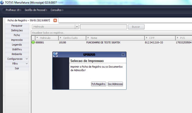 Rotina de integração Protheus X MS-Word Essa rotina foi desenvolvida para automatizar o processo elaboração dos documentos de admissão das empresas preenchendo um documento em Microsoft Word 2003 ou 2007 com dados obtidos a partir do cadastro do funcionário no sistema Microsiga Protheus. Implementada dentro da rotina de Ficha de Registro (padrão do sistema) é estando o usuário posicionado sobre funcionário que deseja gerar os documentos de admissão basta clicar em Impressão e depois selecionar a opção “Fch.Registro”. O usuário selecionará ainda o diretório onde será salvo o arquivo. Por se tratar de um arquivo Word, a empresa poderá utilizar o texto e compor o arquivo da forma que preferir, bastando apenas adicionar as variáveis de documento Word pré-definidas nesse documento. A rotina dispõe ainda de um ponto de entrada que permite que seja inseridas e criadas nova variáveis de documento Word durante o processo de integração. A área de Recursos Humanos da empresa pode a qualquer momento alterar o documento modelo acrescentando ou mudando textos ou a formatação dos documentos.