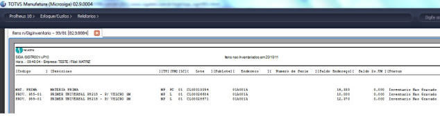 Relatório de Itens não inventariados por endereço Essa rotina foi desenvolvido para agilizar e facilitar o processo de inventario nas empresas que utilizam o sistema Microsiga Protheus. A rotina consiste na geração de relatório informando ao usuário os itens (Lote a lote e endereço a endereço) que possuem saldo no sistema e não tem digitação de inventario. Com isso se um item que está armazenado em vários endereços tenha sido inventariado, porem um endereço especifico não tenha sido esse será demonstrado no relatório. O relatório permite ainda que através de parâmetro seja feita a gravação dos registros de inventario (tabela SB7) de todos os itens não inventariados com quantidade igual a Zero. Isso evita que o usuário tenha que ficar digitando os itens não inventariados, uma vez que eles não tem mais saldo no endereço ou no lote informado.